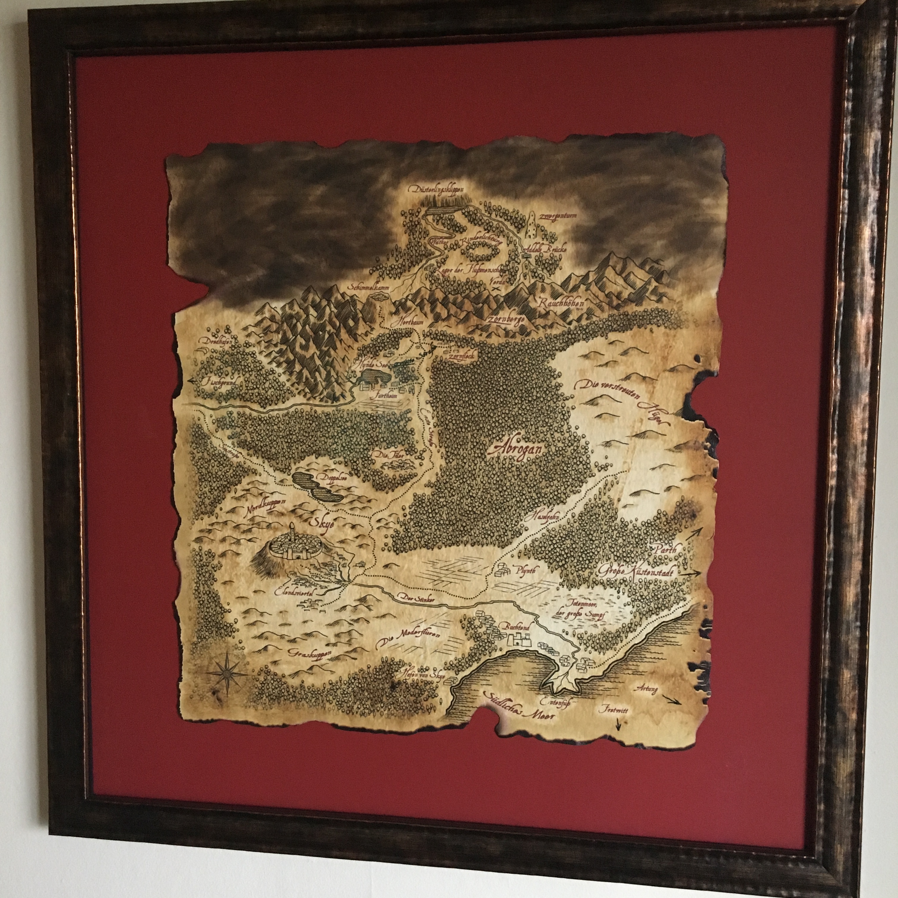 Below, behold the awesome map detailing the Lands of Abrogan in my German Series, Mapper (also available for English readers). My wife had the illustration printed on large format paper, then antiqued it by crumpling it up, staining the paper with tea-colored water and burning the edges. She had it matted and framed by a local shop and viola, an art piece for our entry way. I can’t wait to showcase the next round of maps illustrated for, Die Klinge des Waldes (Deathbringer, Blanvalet).
